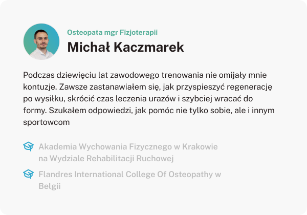 Wiele razy wyprowadził mnie z przeciążenia czy innych dolegliwości sportowych. Zawsze ostrożny w podejmowaniu decyzji, szuka najlepszych rozwiązań dla pacjenta. Wszyscy chcieli abym szedł na zabieg a Michał wierzył ze może obyć się bez i dopiął swego. Dziękuję za opiekę.